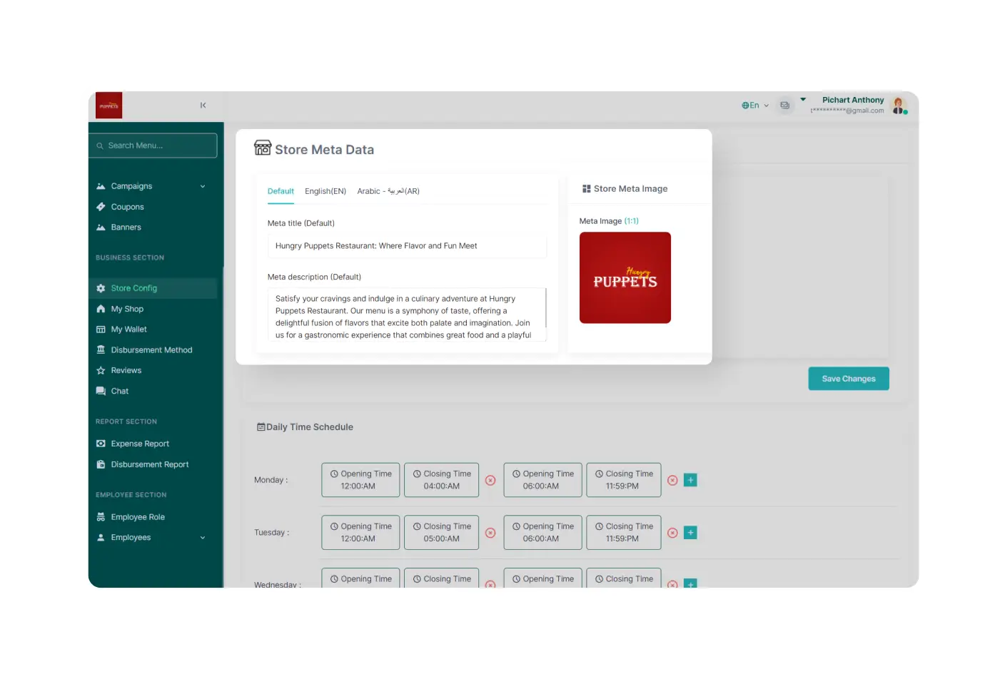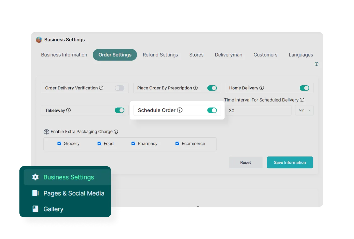 In the business settings section, the admin can configure the entire business, including company details, order settings, refund settings, user settings, and language settings.