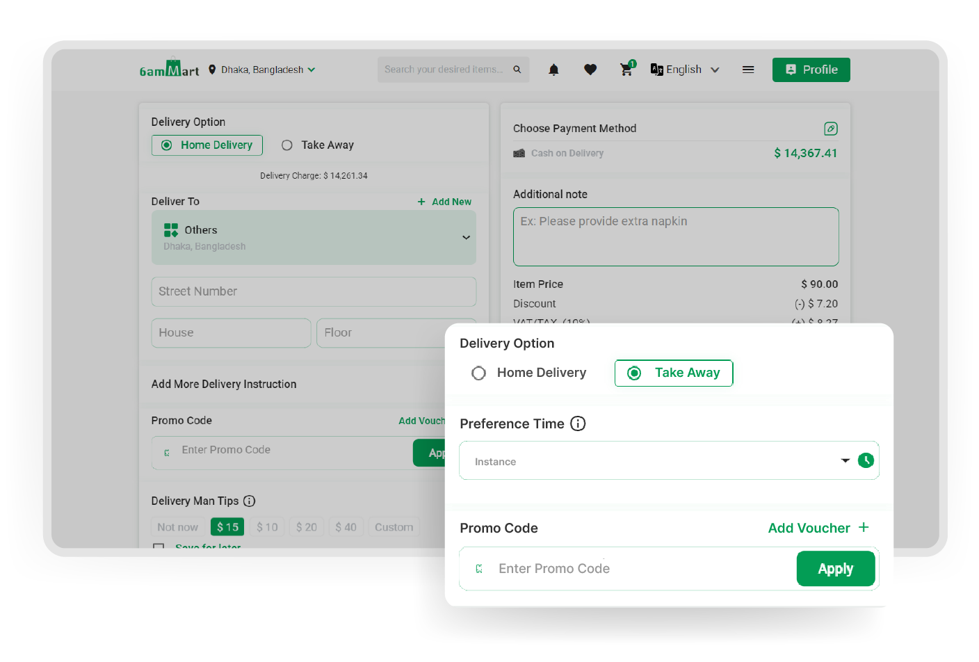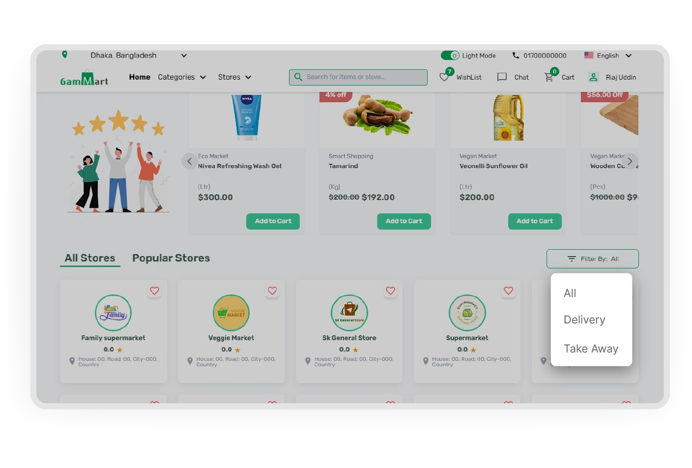Customers can collect products from store by choosing takeaway option during checkout. They can also filter the stores that offer takeaway orders from the 6amMart Flutter web app and choose their favorite store.