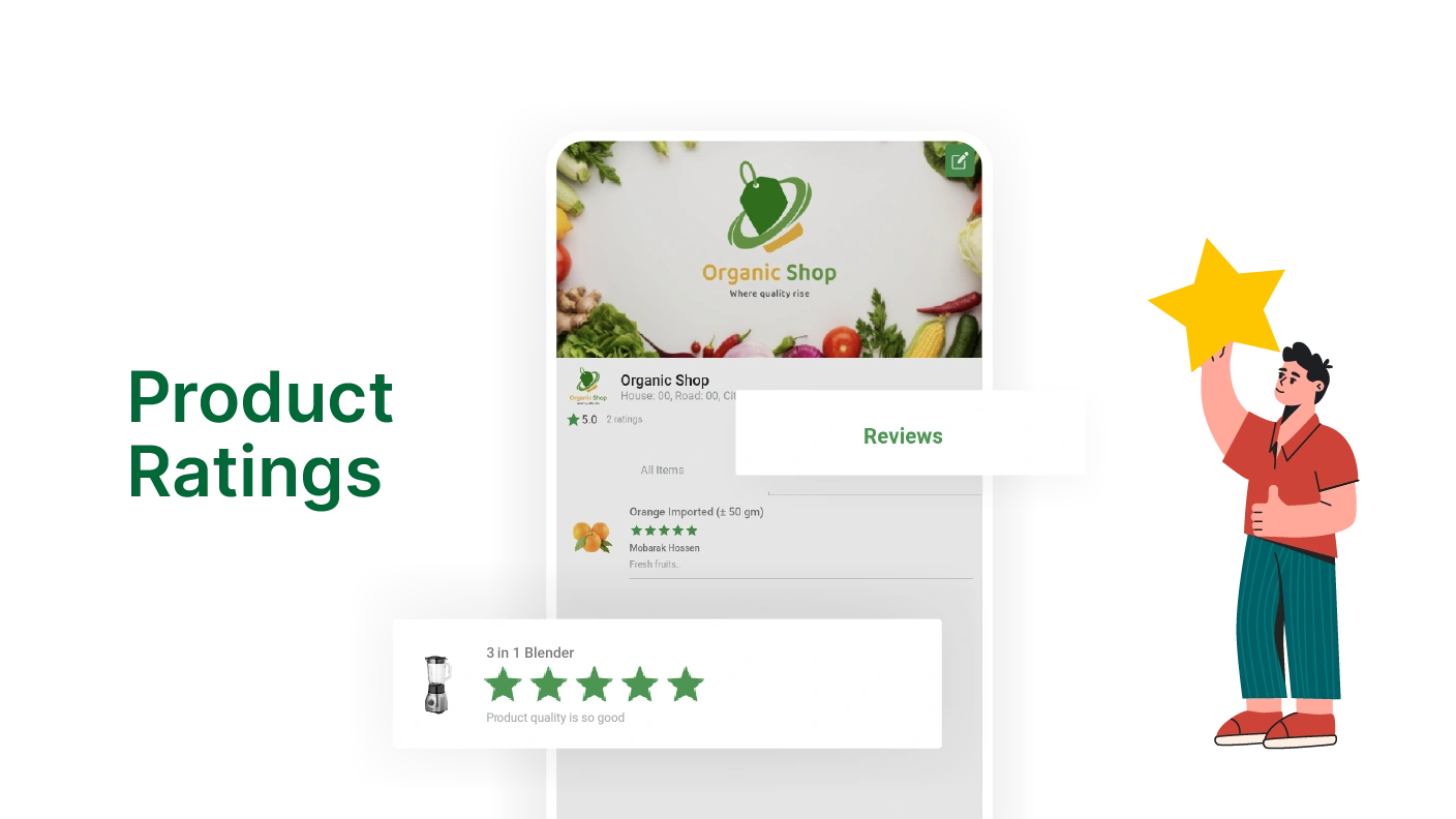 For each module, admin can see reviews and ratings provided by customers for various products, stores, and deliverymen. It helps him quickly monitor their performance and customer satisfaction levels.